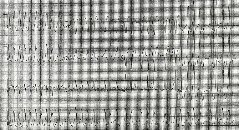 224 ) A 38 year old man presents to the emergency room with complaints of palpitations that started 5 hours ago and are persistent. He denies having similar episodes in the past. He has no fever or shortness of breath or chest pain. His past medical history is unremarkable and he is not on any medications. On examination, blood pressure is 110/60 mmHg, heart rate 130/min, RR 20/min and temperature 98.6 F. Cardiovascular examination reveals irregularly, irregular heart rate at 140beats/min. An Electrocardiogram now is shown below :