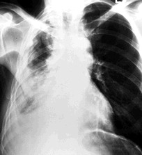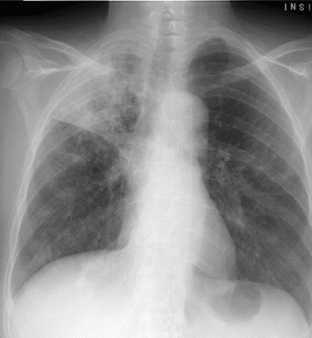 322) A 45 year man is evaluated in emergency department for severe cough accompanied by bloody expectoration. Cough is of 4 month duration associated with sputum production but he is worried because of the new change in the character of his sputum which is now frankly bloody. He reports a weight-loss of 10 lbs in the past two months. He has intermittent nigh-sweats and low grade fever on a daily basis. On examination, his temperature is 100F, Pulse 98/min, RR 20/min and Blood Pressure 100/60 mm HG. He appears cachectic and in moderate distress due to cough. On auscultation, high-pitched bronchial breath sounds are heard in the right upper chest.
