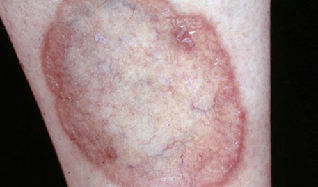 321) A 45 – year-old obese woman presents to your office complaining of a skin lesion on her left shin. This lesion started spontaneously 3 weeks ago and appeared like a small bruise. Over the past two weeks, the lesion has enlarged and the overlying skin has become hardened and raised with reddish border. There is no pain or itching. She denies any recent trauma. She lives in Texas but one month ago, she traveled to New England region to visit a friend. She is sexually active with one partner and occasionally, uses condoms.. Her past medical history is unremarkable. On physical examination, there is an oval shaped lesion on her left shin. The border is indurated and red in color with yellowish, atrophic appearance in the center. An image of the lesion is shown below: