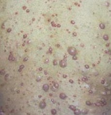 192) A 26-year-old man is evaluated for a history of recurrent headaches and palpitations for the past one month. At this time, he has no headache or palpitations. He denies any chest pain, dizziness or shortness of breath. His past history is unremarkable except for fleshy nodules over his trunk that have been present since adolescence and have been increasing in number. On physical examination, heart rate is 102/min; blood pressure is 168/100 (Lying) and 138/90 ( Standing). Skin examination reveals freckling in the inguinal region and several fleshy tumors on his back as shown in the picture: