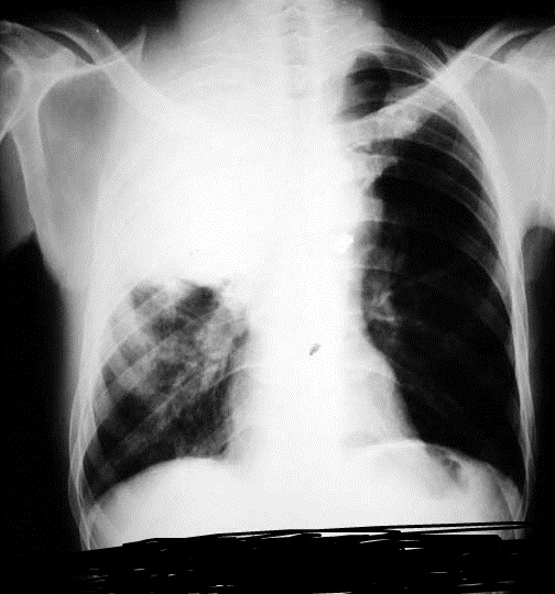 326) A 55 year old african-american man presents to your office with complaints of shortness of breath that has slowly progressed over the past several months. He also reports chest pain which in non-pleuritic in nature. He has lost about 10lbs weight in the past three months. He has changed several jobs but he currently works as a sales representative for a drug company. On examination, his temperature is 100F, Pulse 98/min, RR 20/min and Blood Pressure 100/60 mm HG. He is in mild distress due to shortness of breath. On chest examination, there is dullness to percussion over the right side of the chest. No masses are palpable. Laboratory investigations reveal WBC 8k/μl with normal differential, Hgb 10.5gm%, Platelets 550k/μl, Calcium 11.2gm% ( (Normal 8.9 to 10.5 mg%)