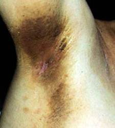8. What is shown is localized hyperpigmentation of the skin also called Acanthosis nigricans descriptively. Acanthosis means epidermal hyperplasia or thickening of the skin. And ‘nigrican describes the dark to black color of the affected skin.