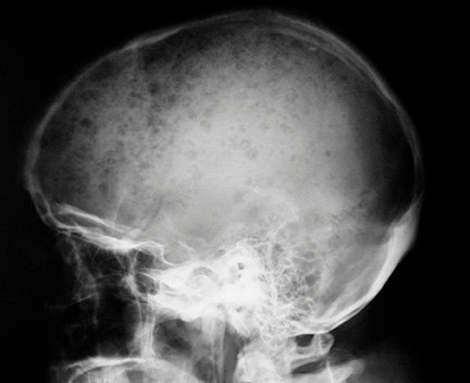 Paget’s disease, on the other hand, is charecterized by mixed osteolytic and osteoblastic phases. Alkaline phosphatase is typically elevated in patients with Pagets. The skull radiograph will show a “cotton wool” appearance caused by irregular areas of sclerosis