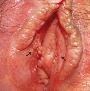 On the other hand, genital warts are not confined to the vestibule. The cauliflower or filiform projections of genital warts tend to fuse at the base and cannot be seperated easily.