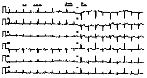 Q80) A 55 y/o male with history of lung cancer recently had a porta cath placed in the SVC. However, one week later he presents to your office with increasing swelling of this face, neck and upper extremities and increasing jugulovenos distension. You diagnose SVC syndrome and your suspicion is confirmed by an SVC venogram. You send the patient to interventional radiologist for SVC dilatation. In the radiology OR patient suddenly becomes unresponsive and hypotensive. His heart rate was 140 and B.P 78/40. He responds well to IV fluids but tachycardia persists. He is then transferred to ICU. You pay him a visit in the ICU and examine him. At the time of your exam he suddenly becomes unresponsive again and his blood pressure drops to 80/40. You restart IV fluids. Chest is clear to auscultation. Heart sounds are audible and normal. He has increased JVD but wife reports he has had this for past one week. The EKG is shown.